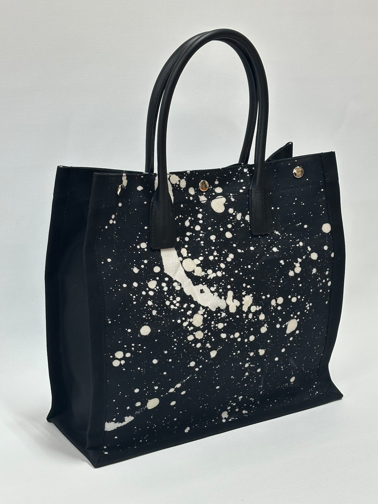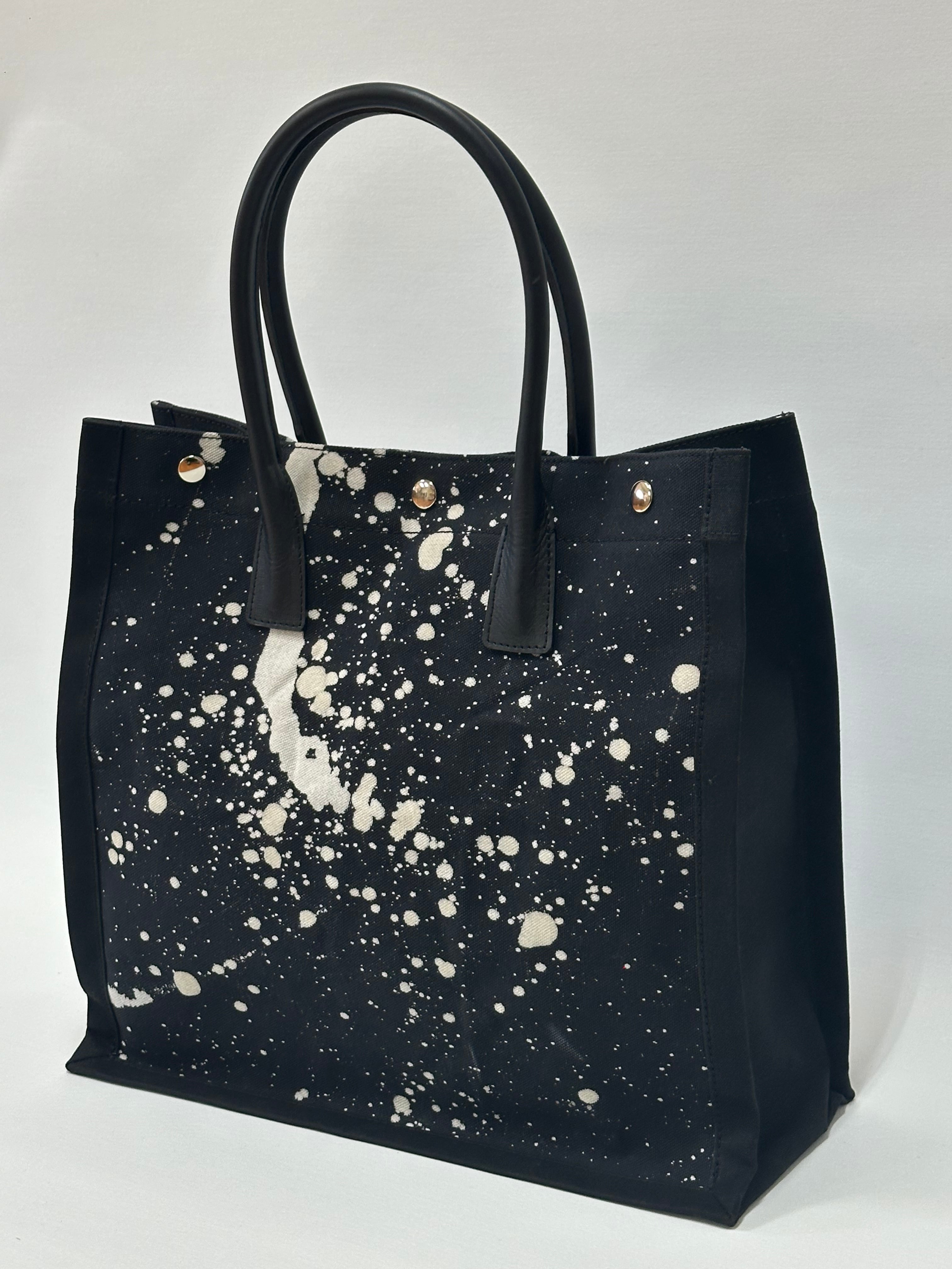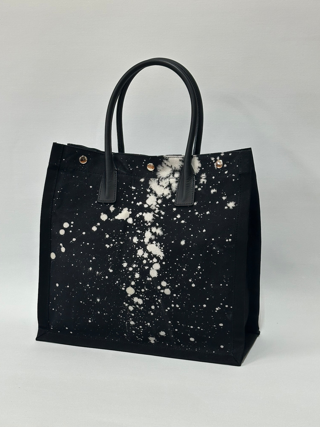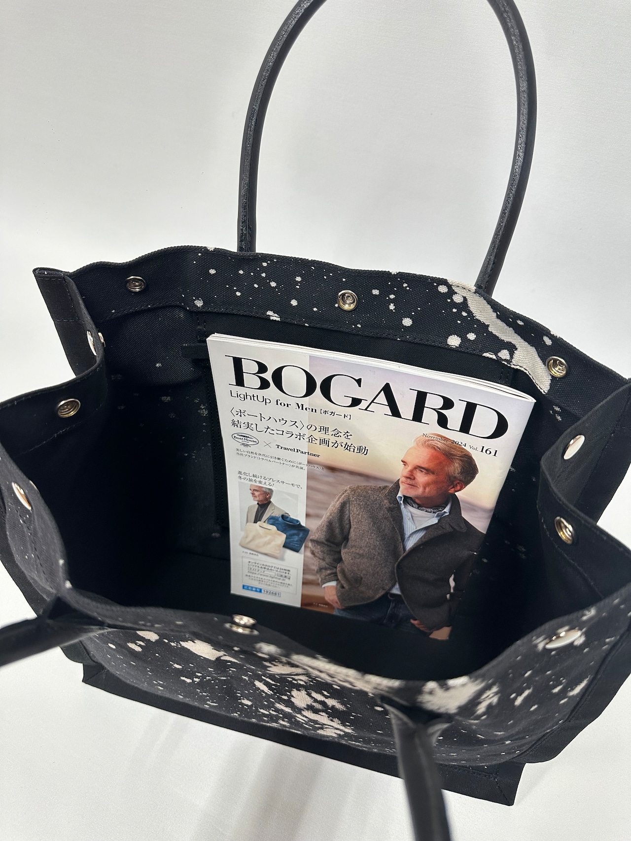 倉敷産の帆布を使用し、BLACKの生地を手作業で抜染した個性的でユニークなスタイルが際立ちます。自分だけの特別なトートバッグをお楽しみください。(写真の配色は1本のみとなります。)