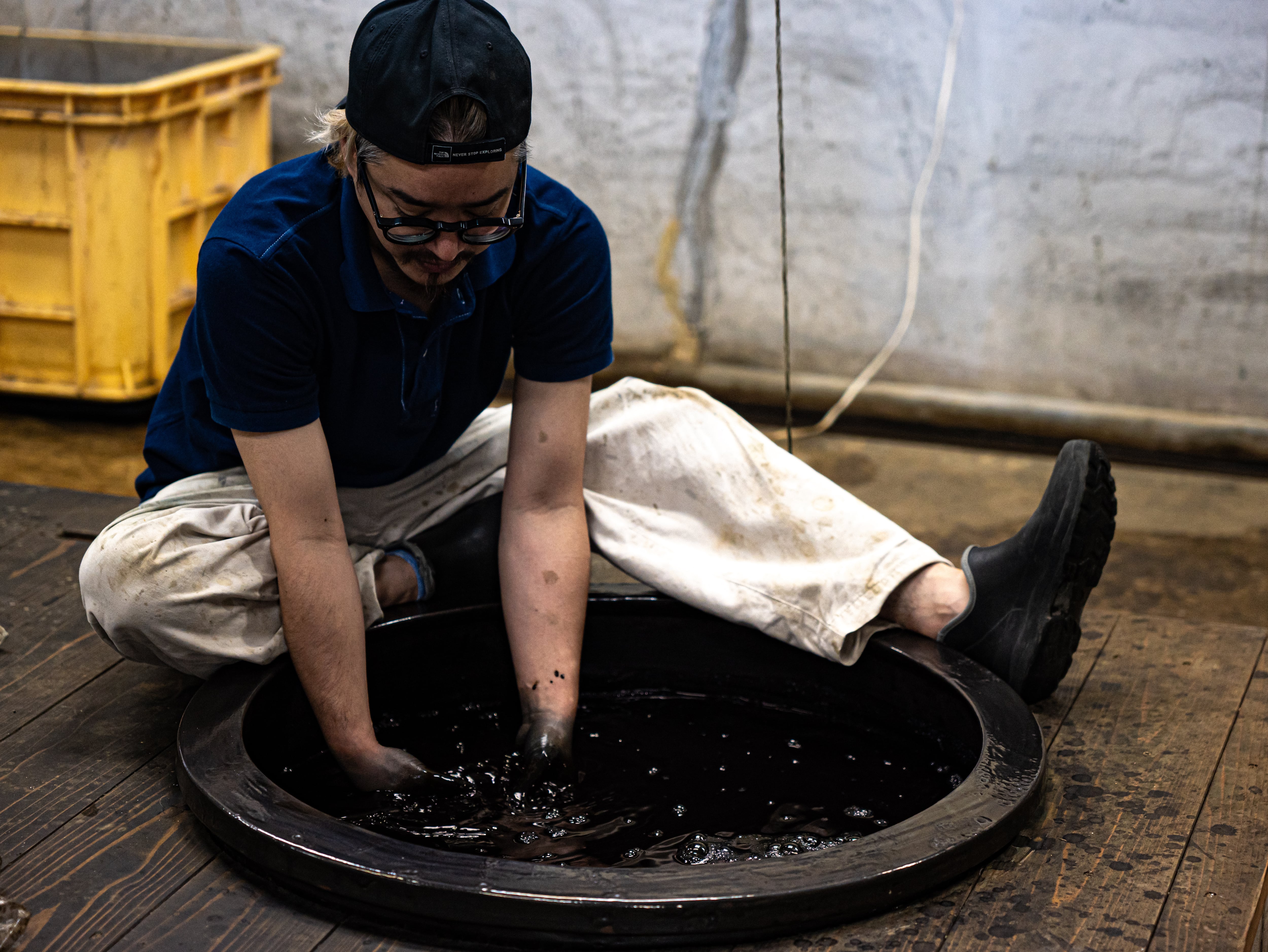 手紐部分の海のような深い青色は、香川県の藍染工房Khimaira様の藍染生地を使用。職人手作業で行われる、むらくも染と呼ばれる手法で、一本づつ染まり方が違います。